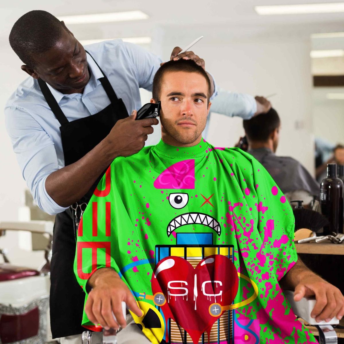 En modern och iögonfallande barber cape i radioaktivt grön design för dig som vill sticka ut i salongen. Perfekt för frisörer och barberare som kombinerar funktion med en stark visuell stil.